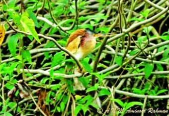 মৌলভীবাজারের বড়শিজোড়া ইকোপার্ক থেকে ফরেস্ট রেঞ্জার মুনির খান ও বন্য প্রাণী বিশেষজ্ঞ তানিয়া খানের সঙ্গে ছুটে চলেছি ভারতীয় সীমান্তবর্তী আদমপুর বিটের দিকে। দেওড়াছড়া টি স্টেট পার হওয়ার পর থেকে সরু রাস্তার দুপাশের ধানখেতের দিকে তীক্ষ নজর রাখছি। না, দেখা পেলাম না। ফিরতি পথে আবারও নজরদারি। না, দেখা গেল না। পরদিন আবার ছুটলাম হাইল হাওরের দিকে। এখানেও নেই। হাইল হাওর থেকে দ্রুত ফিরে ছুটলাম বাইক্কার বিলের দিকে। রাস্তা এখনো পুরোপুরি শুকায়নি। জায়গায় জায়গায় কাদা। কাজেই সিএনজি অটোরিকশা থেকে নেমে প্রায় দেড় কিলোমিটার হেঁটে আইপ্যাকের বালিহাঁসের বাক্সগুলোর দিকে যাচ্ছি। পাশ দিয়ে বয়ে যাওয়া খালটি ঢোলকলমি ও কচুরিপানায় পূর্ণ। তখন চোখে পড়ল হঠাৎ। খানিকটা উড়ে গিয়ে ঢোলকলমিগাছের নিচে বসল। পটাপট কয়েকটা ছবি তুললাম। মনটা ভরে গেল বিরল এই পাখিটি দেখে।